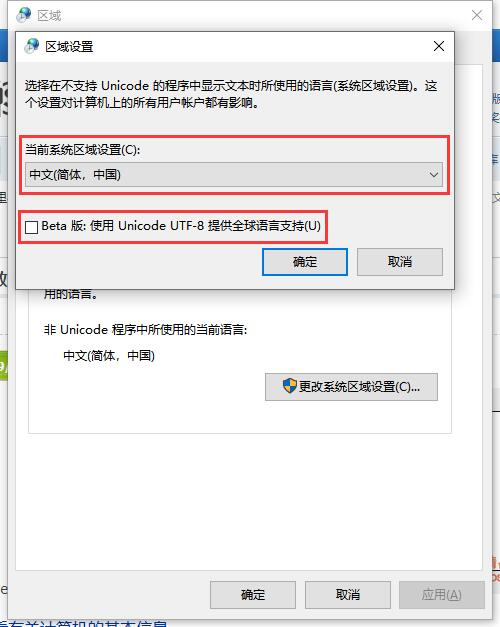 3、当前系统区域设置,选择中文,下面的UTF-8选项,取消勾选,确定保存